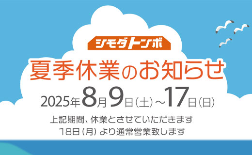 夏季休業のお知らせ いつもシモダトンボ・ネットショップをご愛顧いただき、誠にありがとうございます。 弊社では誠に勝手ながら下記の期間を休業とさせていただきます。 期間中は大変ご不便をおかけしますが、何卒ご了承くださいますようお願い申し上げます。 夏季休業期間 令和7年8月9日(土)~ 8月17日(日) 休業期間中にいただいたご注文、お問合せは8月18日(月)以降に順次対応させていただきます。 大切なお知らせ